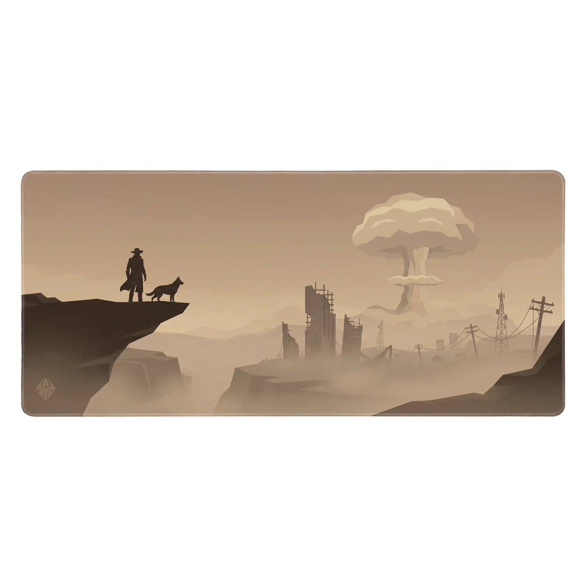 De Wasteland Watch muismat vangt de stilte van een verlaten wereld waar een lone wanderer en zijn hond uitkijken over een verwoeste stad. In de verte rijst een iconische paddenstoelwolk op, badend in warme sepia-tinten die doen denken aan een retro-futuristische wasteland. Een subtiele knipoog naar een bekende post-apocalyptische serie, vertaald naar een stijlvolle muismat die jouw setup een rauwe, cinematografische sfeer geeft.