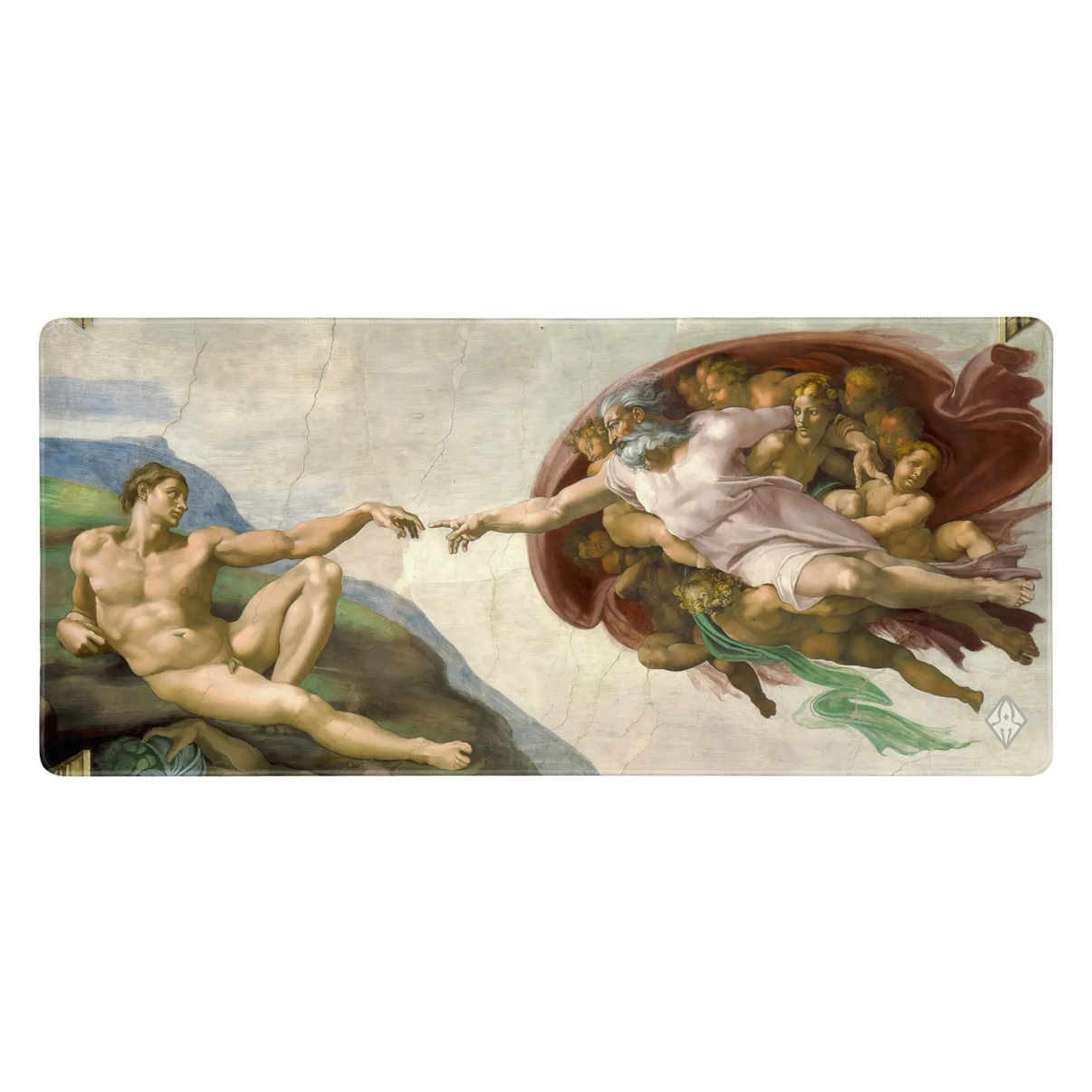 De Schepping van Adam muismat brengt een van de meest iconische kunstwerken uit de renaissance naar je bureau. Het beroemde moment waarop twee vingers elkaar bijna raken is subtiel uitgerekt tot een brede compositie, perfect passend bij het formaat van een desk mat. Gebaseerd op het originele werk van Michelangelo, een tijdloos stuk kunst dat klassieke schoonheid combineert met een moderne setup.
