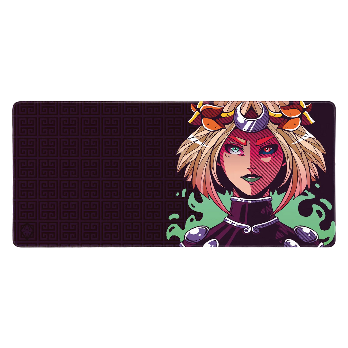 De Warrior muismat toont een krachtige anime-geïnspireerde krijger met een opvallende kroon en intense blik. Het diepe paarse patroon op de achtergrond contrasteert met de felle kleuren en scherpe lijnen van het karakter, waardoor het ontwerp direct opvalt. Gemaakt in samenwerking met illustrator Chofy87, die voor elk verkocht exemplaar een commissie ontvangt.