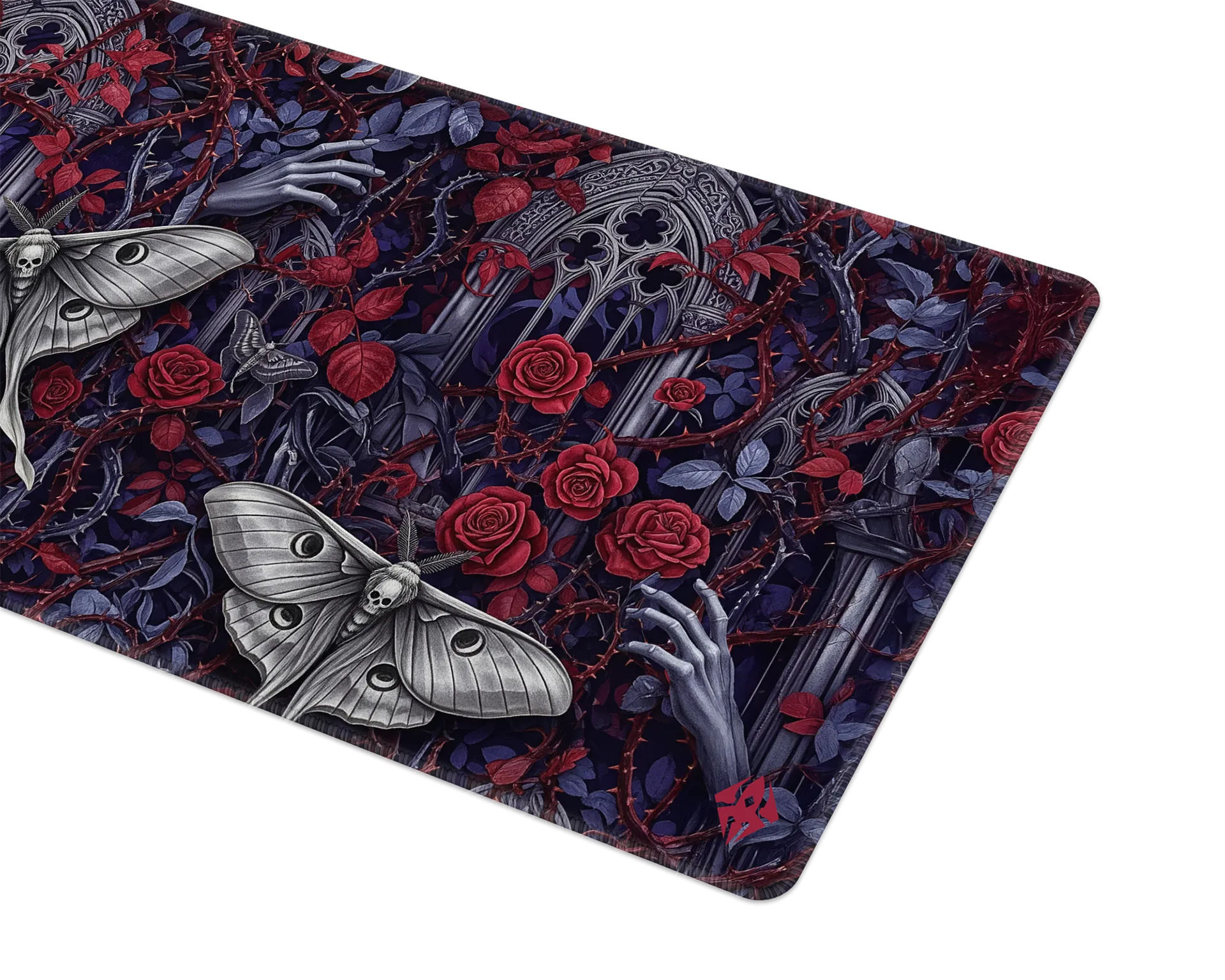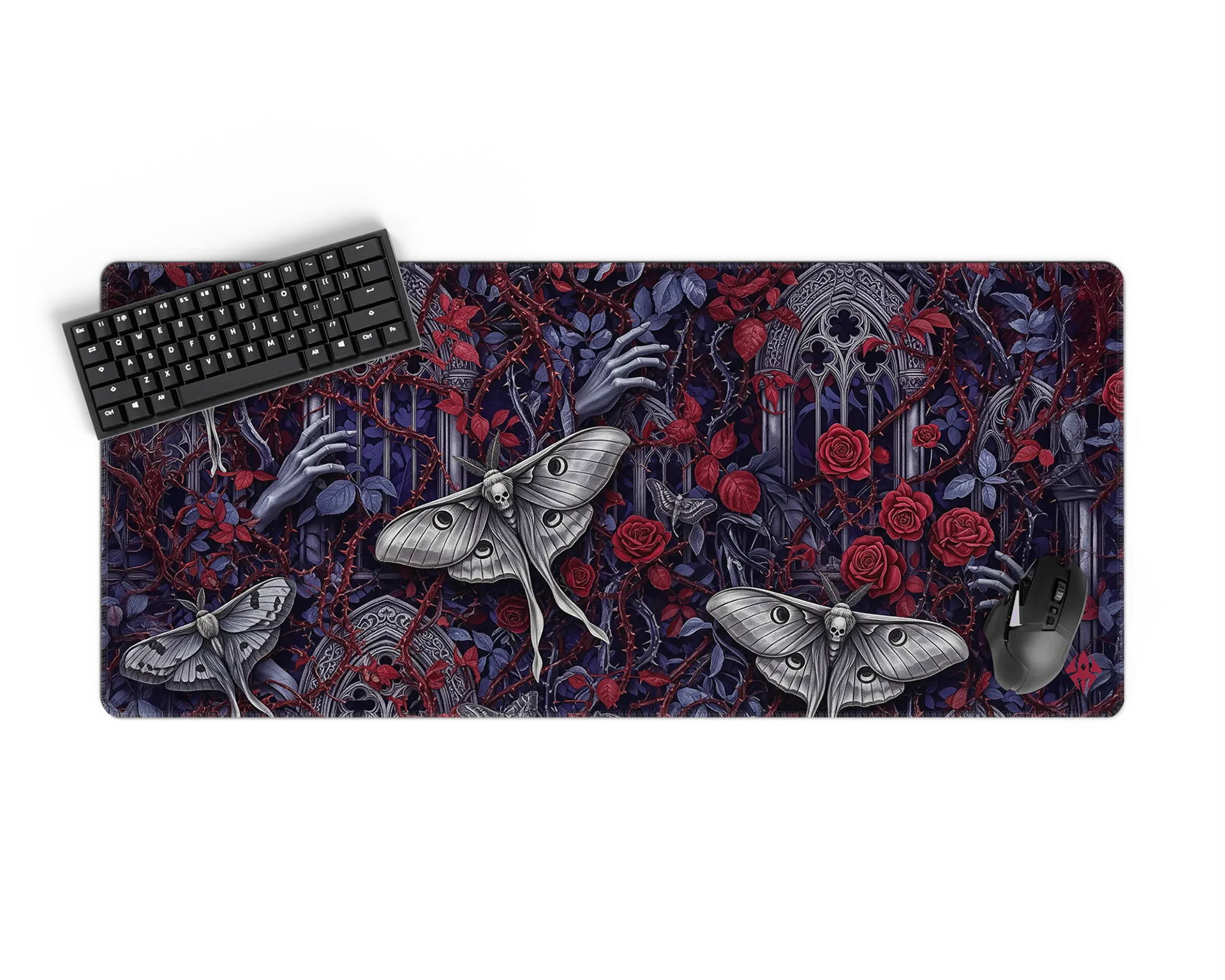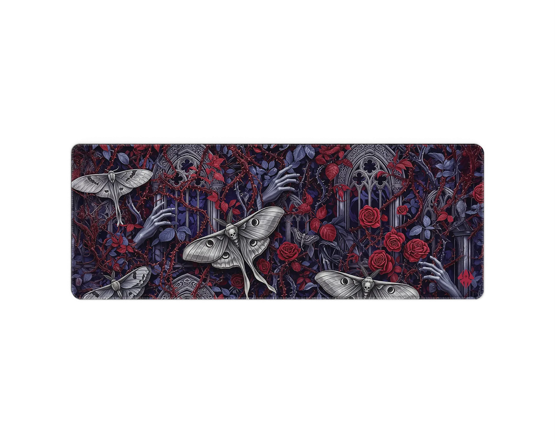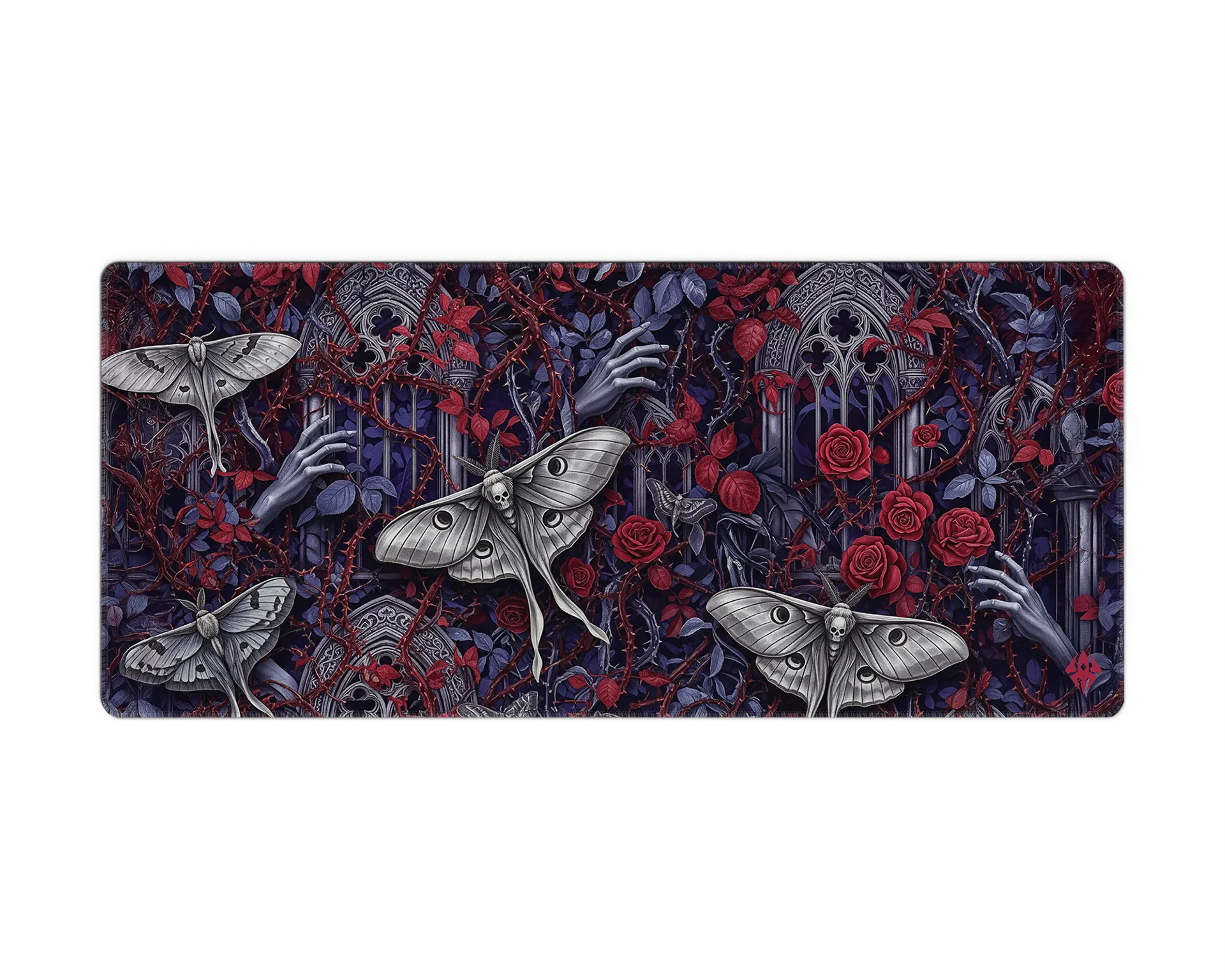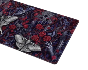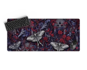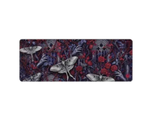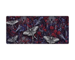 De Goth Moths muismat is een duister meesterwerk vol details. Tussen verwrongen takken, rozen en gebeeldhouwde ramen fladderen imposante nachtmotten met schedelmotdetails, terwijl bleke handen zich een weg banen door het doornige decor. De diepe paarstinten en bloederige rode accenten maken dit design tot een intens visueel statement. Perfect voor liefhebbers van gothic art, duistere mystiek en een setup met een vleugje drama.