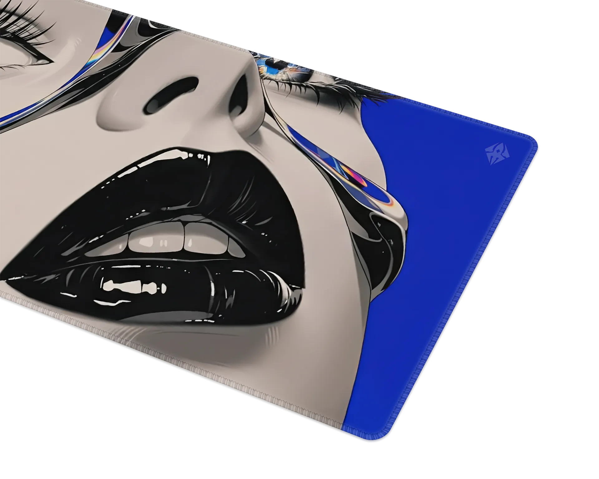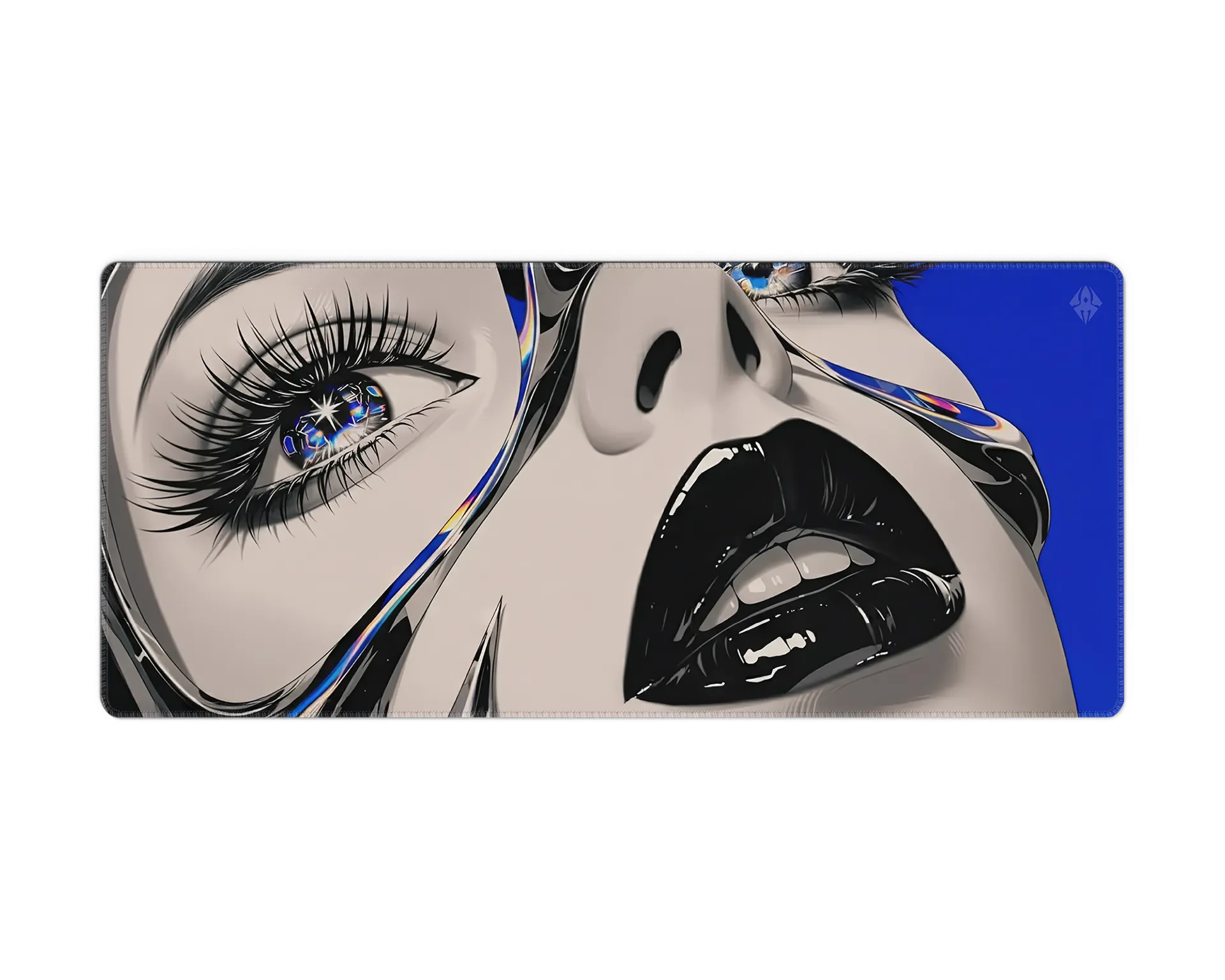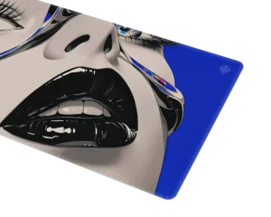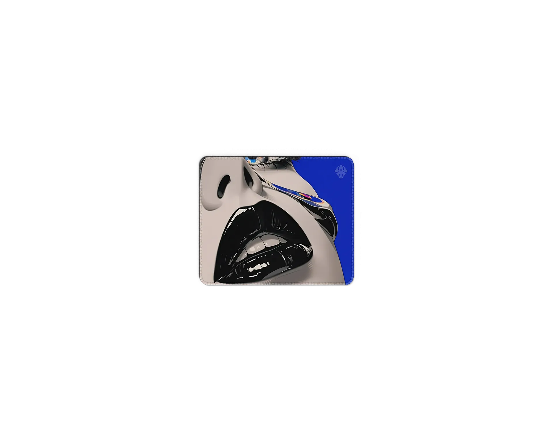 De Prism Lips muismat is een explosie van stijl en sensualiteit met een futuristische twist. Een close-up van een glossy zwartgelakte mond en sprankelende ogen wordt versterkt door chromen lijnen en regenboogreflecties die over het gezicht dansen. Het diepe kobaltblauw op de achtergrond maakt het geheel krachtig en iconisch. Deze muismat is perfect voor wie houdt van bold art, high fashion aesthetics en een setup met attitude.