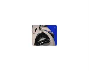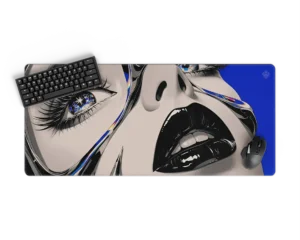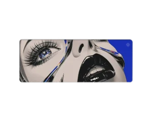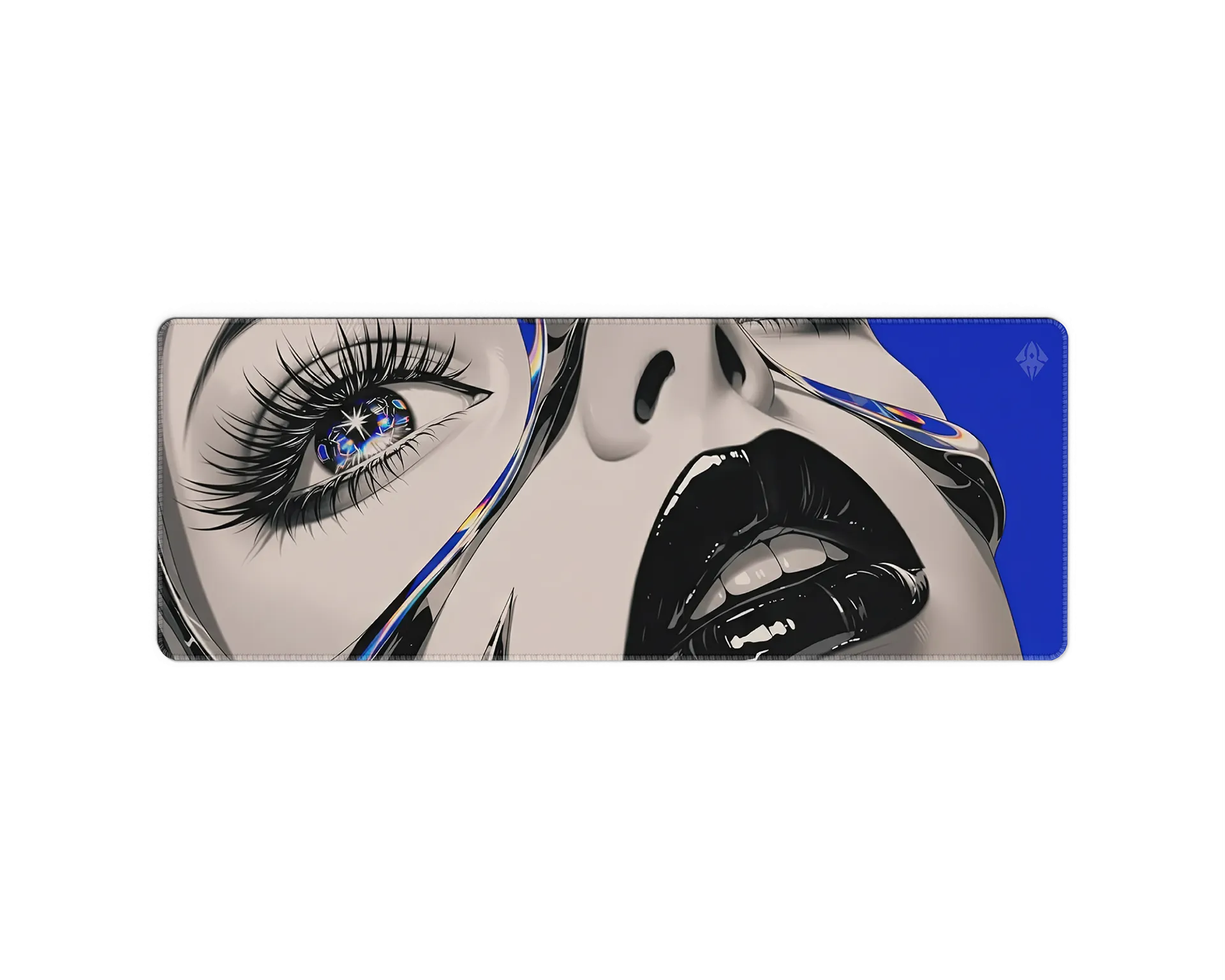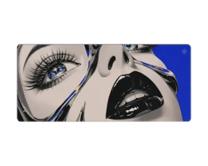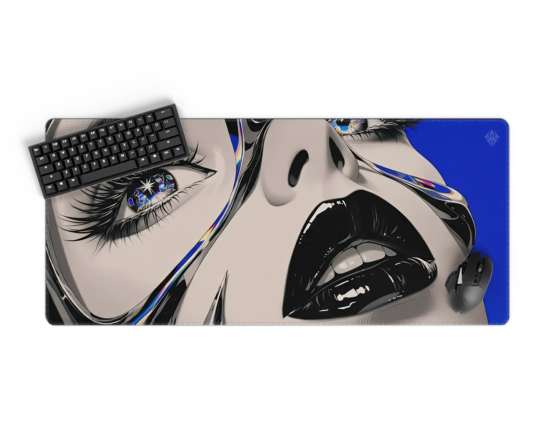 De Prism Lips muismat is een explosie van stijl en sensualiteit met een futuristische twist. Een close-up van een glossy zwartgelakte mond en sprankelende ogen wordt versterkt door chromen lijnen en regenboogreflecties die over het gezicht dansen. Het diepe kobaltblauw op de achtergrond maakt het geheel krachtig en iconisch. Deze muismat is perfect voor wie houdt van bold art, high fashion aesthetics en een setup met attitude.